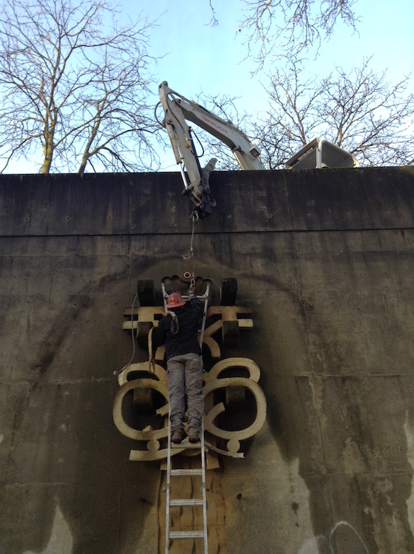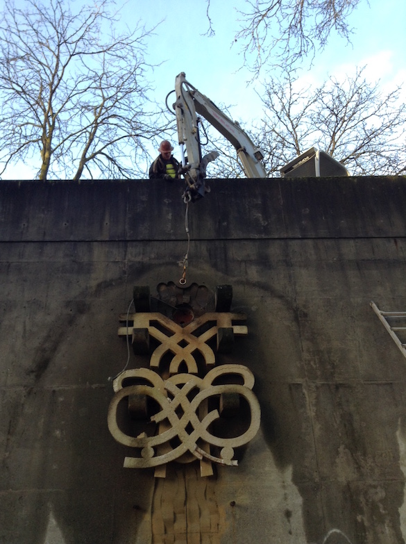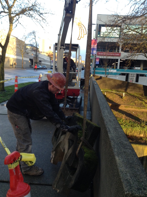 UPDATE | WEDS., JAN. 20 @ 10:20 A.M. — Combined Construction and City of Tacoma Public Art Specialist Rebecca Solverson were on-site Wednesday morning to remove the 40-year-old Harold Balazs art installation in downtown Tacoma. The installation consisted of six fairly brittle, re-bar exposed, moss-covered pieces of concrete that were hoisted over the wall at Bicentennial Pavilion and later loaded onto the back of the contractor’s pick-up truck. The Tacoma Daily Index will have a longer feature article later this week. In the interim, here are some photos from Wednesday morning.