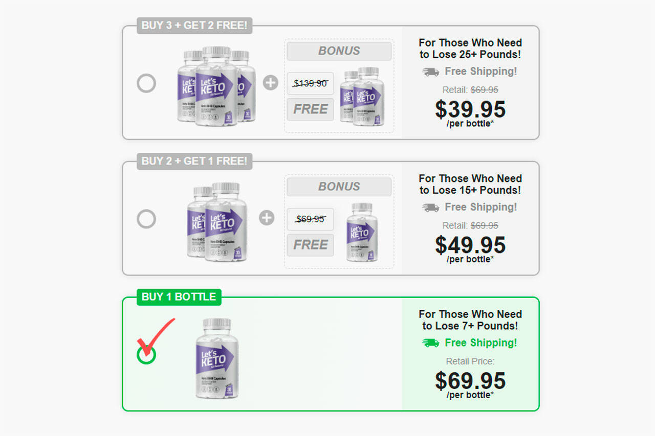 According to the Let’s Keto checkout page, customers can lose more than 25lbs with the 5 bottle package of Let’s Keto, 15+lbs with the 3 bottle package, and 7+lbs with the 1 bottle package