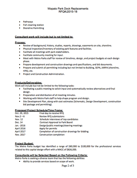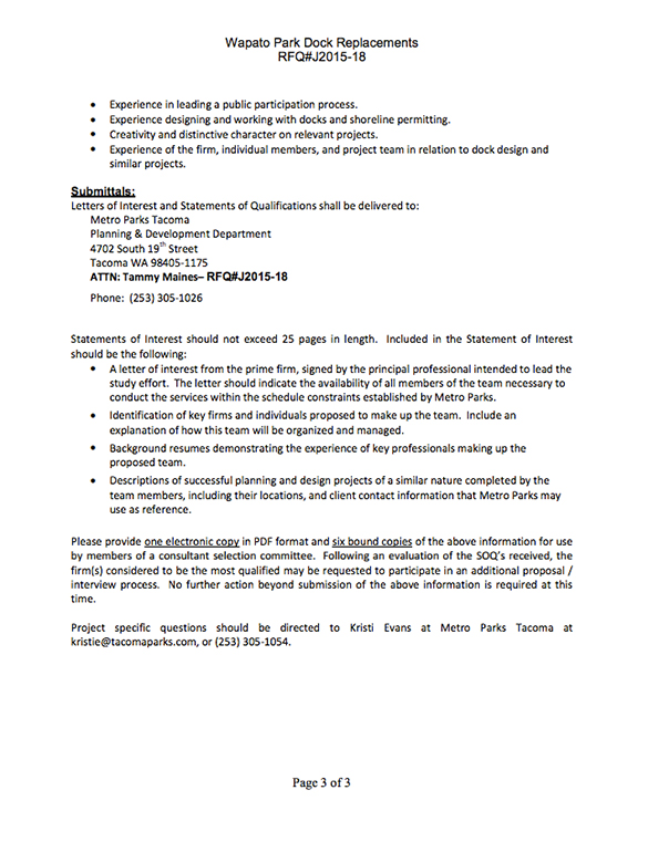 Metro Parks Tacoma has issued a Request For Qualifications (RFQ) for architectural and engineering services related to a project to replace the docks at Wapato Park, according to a legal notice published this month in the Tacoma Daily Index.