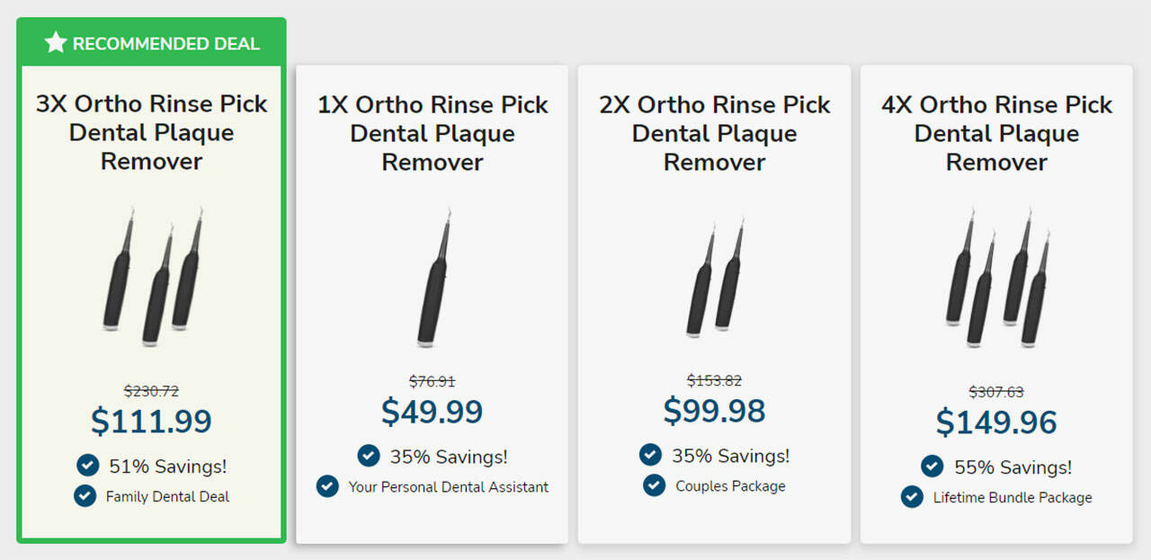 Ortho Rinse Pick is priced at $49.99 per dental plaque remover. The more you buy, the more you can save. As part of a 2023 promotion, you can save as much as 50% off the ordinary retail price of the Ortho Rinse Pick (it’s normally priced at $76.91 per dental plaque remover).