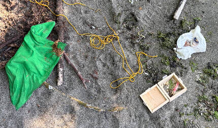 Ewing said he removed the green cloth and found a pine box shut with tape. He opened it with his pocket knife and found a feather, grass that had been burned, sage, lavender, tobacco and a rag with something inside it. He said when he unwrapped the rag, he quickly realized it was not related to any common Native American practices he is aware of.