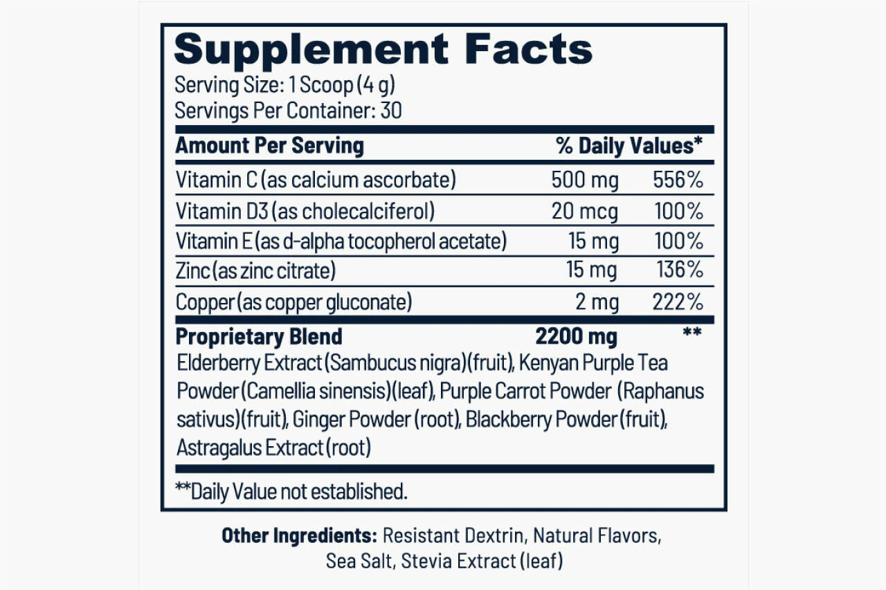 - 2,200mg of the Peak Immunity Proprietary Blend with elderberry extract, Kenyan purple tea powder, purple carrot powder, ginger powder, blackberry powder, and astragalus root extract