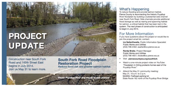 Pierce County staff will be available from 10 a.m. to 2 p.m. on Sat., May 31, at the McMillin Trailhead parking lot to share project information and answer questions. The parking lot is located along the Foothills Trail at approximately 140th Street East and State Route 162, just south of the bridge over the Puyallup River.