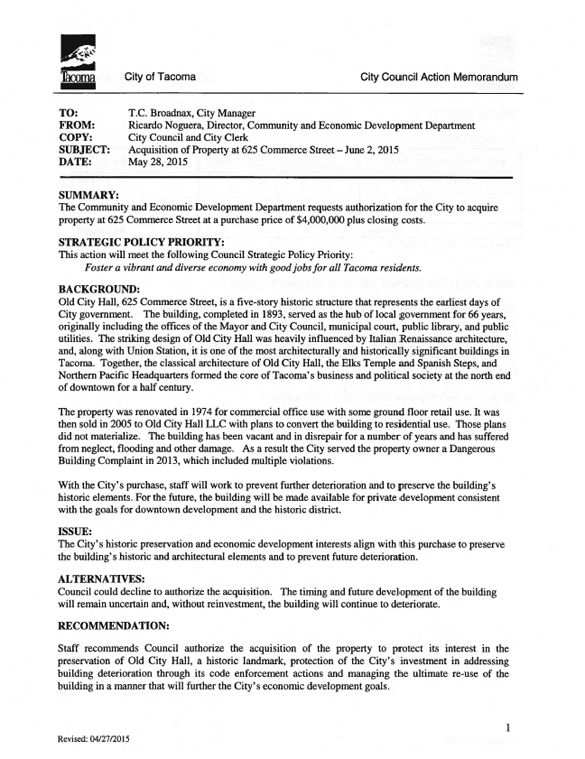 If a resolution is approved by Tacoma City Council next week, the City would acquire the building, located at 625 Commerce St., from Seattle-based The Stratford Co. for $4 million (plus closing costs), address the structure’s deteriorating condition, preserve its historic elements, and market the property for future development.
