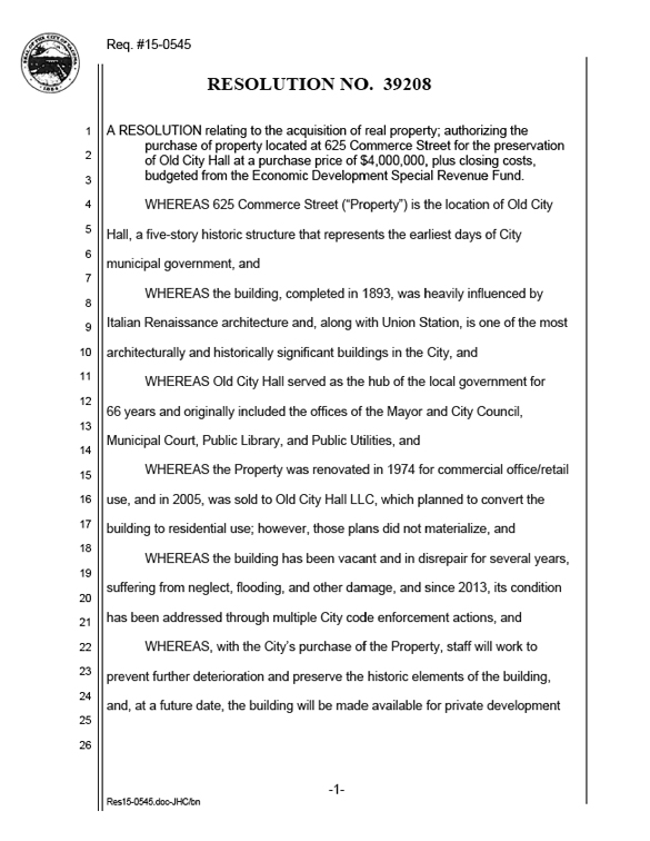 Old City Hall was built in 1893 and originally included the offices of the mayor and city council, municipal court, public library, and public utilities. It was then renovated in 1974 for commercial office use with some ground floor retail use, and sold in 2005 with plans for conversion to residential use. Those plans did not materialize and the building has been vacant for a number of years, suffering from neglect, flooding, and other damage, according to City officials.