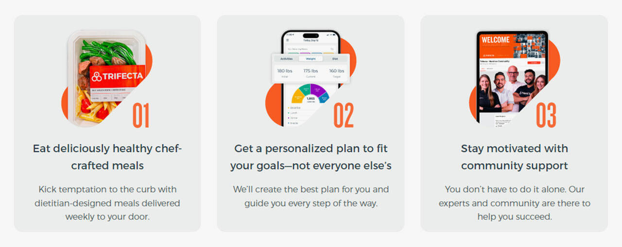 Step 2) Get a personalized plan to fit your goals. You have personalized weight loss and health goals. Trifecta will create the best plan for you, then guide you at every step of the way to achieve optimal health outcomes.
