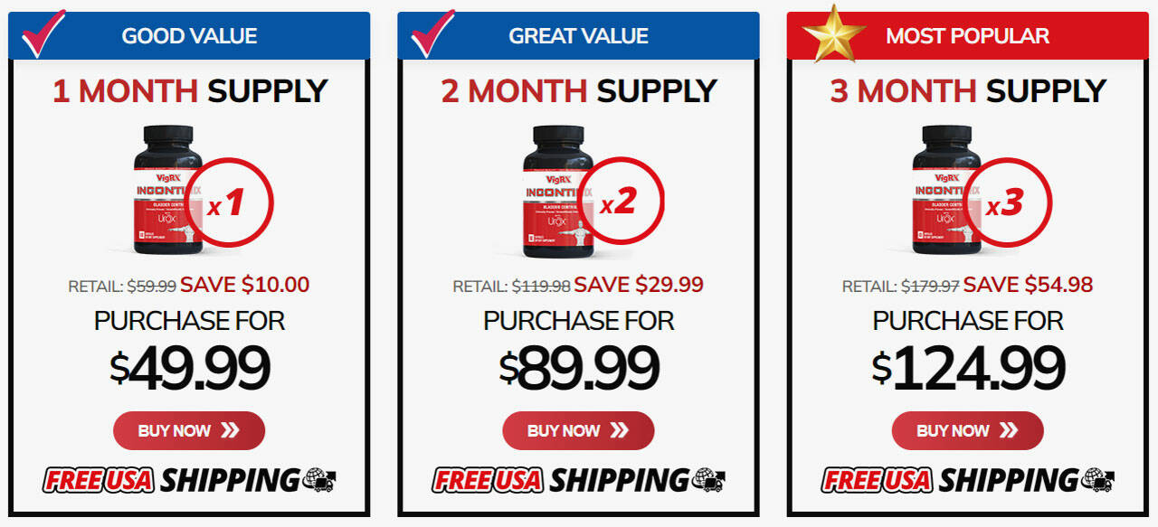 Incontinix is priced at $49.99 per bottle, with each bottle containing a one month supply of bladder support formula (60 capsules). You take one serving (2 capsules) daily to support bladder control.