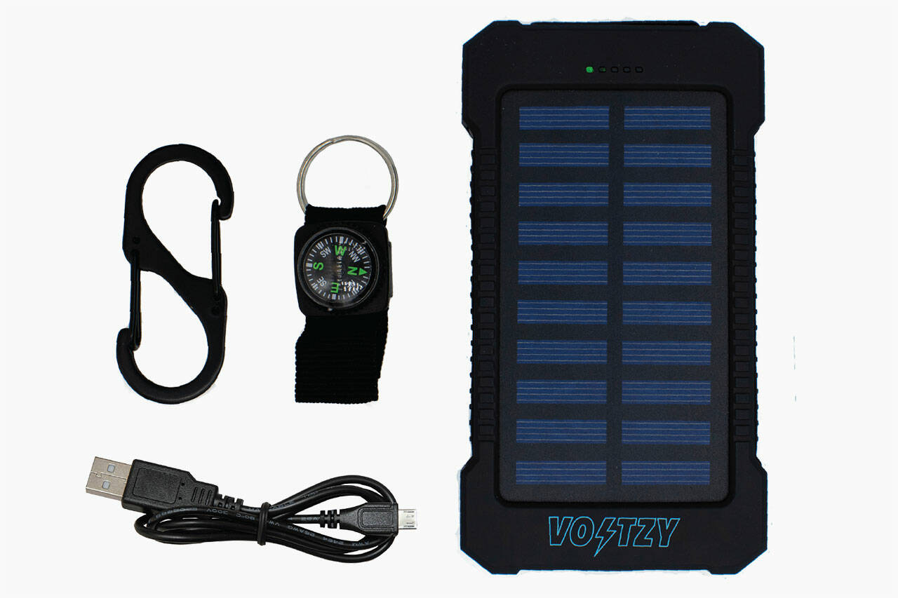 Each Voltzy purchase comes with 1 x Voltzy battery, 1 x USB-C adaptor, 1 x charging cord, and 1 x miniature compass.