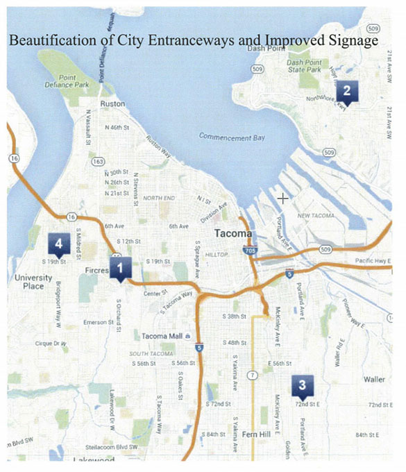 Last year, Tacoma City Manager T.C. Broadnax directed City staff to identify locations throughout Tacoma for future beautification and capital improvements as part of the Beautification of City Entranceways and Improved Signage Project, according to a Nov. 24 staff memo. City staff focused on arterials that crossed Tacoma city boundaries, resulting in nine potential locations being identified for the installation of entranceway gateway signs. That list was later narrowed down to four locations: South 19th Street and South Jackson Avenue; South Center Street and South Mullen Street; Northshore Parkway and 45th Avenue; and South 72nd Street and East F Street.