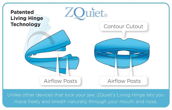 However, ZQuiet differs from other MADs and mouthpieces by its low profile and hinged design. This makes ZQuiet less intrusive than similar devices that make use of a hard plastic outer shell. This allows the user more airflow by allowing a wider range of jaw movement.